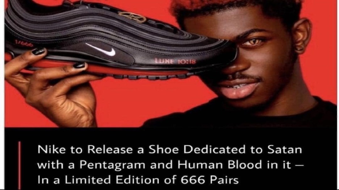 The $1,018 (£740) trainers, which feature an inverted cross, a pentagram and the words “Luke 10:18”, were made using modified Nike Air Max 97s.