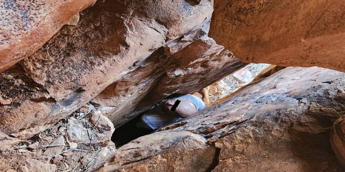 The man could barely touch the rock below him with his toes, and his chest was so constricted by the rocks sandwiching him that he could only take short breaths.